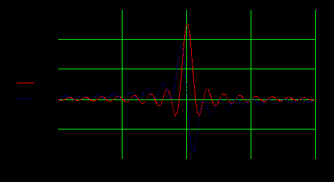Как и ожидалось (на основании теоремы запаздывания), сдвиг сигнала вдоль оси времени не изменяет его АЧС, а лишь добавляет линейный член к ФЧС (с отрицательным наклоном при запаздывании сигнала и положительным - при опережении). Чем больше этот временной сдвиг, тем круче эта линейная добавка к ФЧС. Это подтверждается сравнением Рис. 8 и Рис. 1-10.