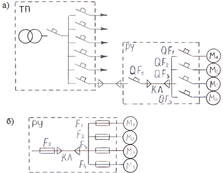 Рис. 2. Участок радиальной схемы цеховой электрической сети (ТП – трансформаторная подстанция; РУ – распределительное устройство; КЛ - кабель; QF1 – QF5 – автоматы; М1 – М4 – двигатели; F1 - F5 – плавкие предохранители)