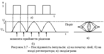 Щоб знайти аналогічні (21) та (22) вирази для цифрових систем передачі потрібно визначати зв’язок між відношенням сигнал/шум та ймовірністю помилки, для чого необхідно проаналізувати процедуру прийняття рішення (стробування) регенеруючим пристроєм. Ця процедура проста, але вона ускладнюється спотвореннями сигналу на виході приймального пристрою. Це явище виникає з двох причин. По-перше, внаслідок обмеження смуги пропускання приймача, а інколи і лінії зв’язку (в разі використання багатомодового світловода) форма імпульсу, що приймається, відрізняється від прямокутної форми. Спостерігаються "хвости" імпульсів поза робочим проміжком часу – міжсимвольна завада (рис. 2), рівні, що відповідають символам "0", не є нульовими.