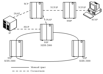 У випадку розподіленої IN необхідно встановити додаткове обладнання: вузол SCP, вузол SMP, вузол SCEP і IP. На рис. 1 наведено архітектуру IN Lucent Technologies з використанням розподіленої платформи із зазначенням інтерфейсів між окремими мережними елементами. Чим більша кількість станцій нижнього рівня мережі охоплена функціями SSP, тим вища ефективність IN.