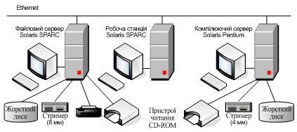 Апаратна частина SCEP (рис. 5) складається з файлового сервера SUN Solaris Sparс, робочих станцій розробників послуг Sun Sparс і компілюючих серверів SUN Solaris Pentium, ресурси яких у розділюваному режимі доступні будь-якій робочій станції через локальну мережу Ethernet.