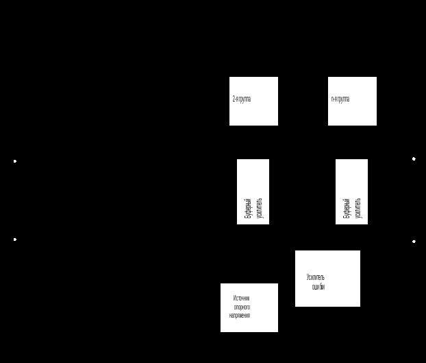 Силовые транзисторы стабилизатора объединяются в группы по 5 – 6 транзисторов, которые размещаются на общем радиаторе, охлаждаемом водой. В эмиттеры транзисторов включены резисторы сопротивлением 0,2 – 0,5 Ом для выравнивания протекающих через них токов. Буферные усилители тока представляют собой составное включение транзисторов.