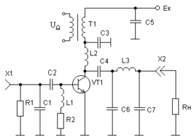 На рисунке 1 представлена схема рассчитываемого ГВВ применительно к случаю амплитудной модуляции коллекторного типа, где Т1 - модуляционный трансформатор. В ГВВ с другими видами модуляции (ОМ, ЧМ) этого трансформатора не будет.