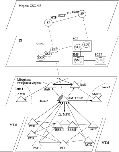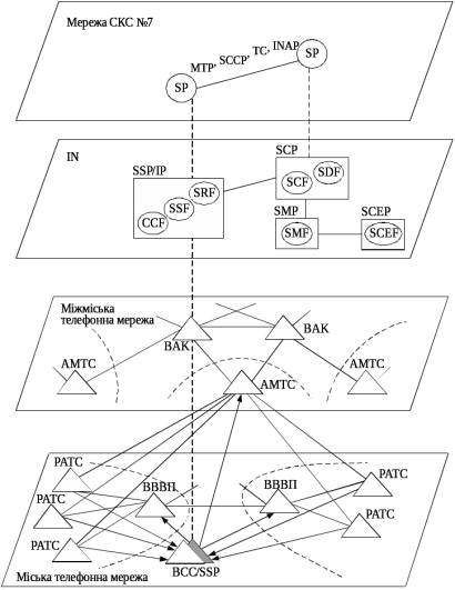 Рисунок 2. – Взаємозв'язок між конфігураціями телефонної мережі, інтелектуальної мережі та мережі СКС №7 (доступ до IN через АМТС)