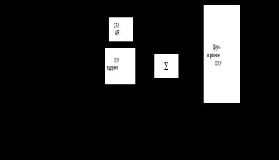 Поступающие с АЦП данные записываются в двухпортовое ОЗУ по адресам AWR, выставляемым счетчиком СТА, а считываются эти данные по адресам ARD. Они представляют собой сумму адреса AWR и данных, которые устанавливаются в ОЗУ задержек. Сразу после записи данных АЦП происходит переключение в режим чтения, и данные из ОЗУ задержек начинают суммироваться с адресом AWR. Через некоторое число тактов fT наступает равенство ARD и AWR, по которому была произведена запись данных АЦП. Это число тактов и величина fT и определяют время задержки. В этом же канале производят апподизацию – умножение выходного сигнала на некоторый коэффициент, который записывается в то же ОЗУ, что и задержки. Апподизация предназначена для формирования желаемой характеристики направленности антенной решетки при приеме (например, для исключения боковых лепестков).