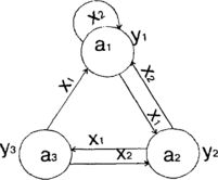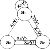 Пример заполнения таблицы выходов некоторого абстрактного полностью определенного автомата с входным алфавитом X={x1, x2}, алфавитом состояний A={a1, а2, а3} и выходным алфавитом Y={y1, y2, y3}-представлен в табл.1.4.