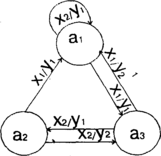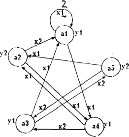 Так как (a1, x1) = а3, a (a1, x1) = y1, то под действием первой буквы слова Х входного сигнала x1 автомат перейдет в состояние a3 и на выходе его появится сигнал y1. Далее, (а3, x1) = a1, а (а3, x1) = у2, потому при приходе второго сигнала x1 автомат окажется в состоянии a1, а на выходе его появится сигнал у2. Проследив непосредственно по графу или таблицам переходов и выходов дальнейшее поведение автомата, опишем его тремя строчками, первая из которых соответствует входному слову X, вторая - последовательности состояний, которые проходит автомат под действием букв слова X, третья - выходному слову У, которое появляется на выходе автомата: