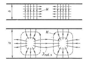 в волне рассматриваемого типа известна, построение линий тока на стенках не представляет затруднений: эти линии образуют семейство кривых, ортогональных семейству силовых линий напряженности магнитного поля Рис.4.. Подчеркнем еще раз, что здесь изображена картина мгновенного распределения токов; во времени она перемещается вдоль оси волновода с фазовой скоростью.