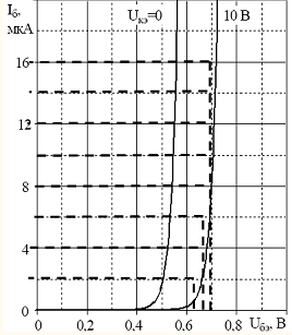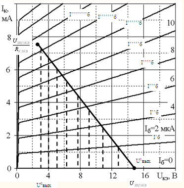 По координатам точек пересечения нагрузочной прямой с выходными характеристиками, соответствующими токам базы Iб = Iб';Iб'';…, определяются значения напряжения коллектор – эмиттер, которое является выходным Uкэ = Uвых . Далее по входной характеристике БТ Iб = f (Uбэ) при Uкэ > 0 для тех же значений тока базы находятся соответствующие напряжения база-эмиттер Uбэ = Uбэ';Uбэ'';… .