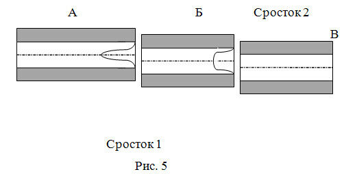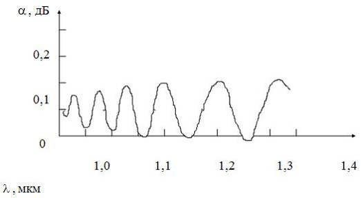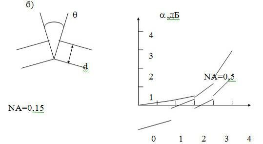В многомодовых световодах полные потери на стыке волокон обычно меньше, чем сумма отдельных внутренних и внешних составляющих. Принято считать, что потери на стыке многомодовых волокон не зависят от длины волны. В действительности из-за несоответствия внутренних параметров волокон на стыке возникают пульсации (осцилляции) потерь, которые присходят вследствии того, что принимающее волокно не может принять все моды от передающего (рис. 4).