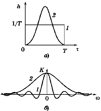 Модуль этой частотной характеристики показан на рис. 5, б (кривая 1). Из ее графика видно, что частотная характеристика (8) существенно неравномерна и на частотах, кратных π/Т, обращается в нуль, то есть сигнал на этих частотах полностью подавляется.