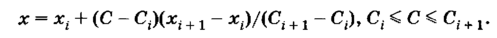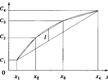 Кусочно-линейная аппроксимация (на рис. 4 длина отрезка 1 характеризует нелинейность) заключается в том, что нелинейная характеристика канала заменяется отрезками прямых, проходящих через экспериментально полученные точки (xi; Ci) и (хi + 1; Ci + l), где i = 1, п. Обычно число точек равно 6... 11, что соответствует аппроксимации пятьюдесятью отрезками прямых.
