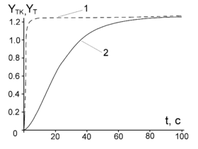 Для порівняння динамічних характеристик термометру опору у випадках, коли чутливий елемент знаходиться безпосередньо у вимірювальному середовищі, або відокремлений від нього захисним кожухом, побудуємо їх динамічні характеристики на одному графіку (рис. 4).