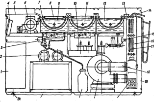 В машину входят: система циркуляции растворов, которая состоит из блока насосов 2 и блока фильтров 10; система дозирования проявителя, которая содержит насос с приводом 3 и емкость 22 для закрепляющего раствора; валиковый транспортировочный механизм 7 с приводом 6; пульт управления 4; електрошкаф 1. Снизу расположены поддоны 23, а для предотвращение окисления в кюветах предусмотрены крышки 8. Количество воды, которая подается в кюветы промывки, регулируются вентилем 15.
