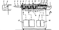 Секция сушки. В секции сушки 11 с поверхности пленки удаляется влага, после чего пленку можно сразу же брать в руки. В секции установлен центробежный вентилятор 14 с вмонтированным нагревателем и распределительные воздухопроводы один над одним под несущим каркасом.
