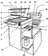 Секция проявления и фиксажа. В секции проявления 7 скрытое изображение после экспонирования проявляется, в секции фиксажа 8 оно закрепляется, а непроэкспонированный галогенид серебра растворяется. Секции проявления и фиксажа идентичны, за исключением несущих каркасов, на которых закрепляются нагреватели и термостаты для поддержки постоянной температуры.