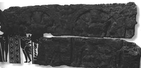 На полу зала было найдено большое количество сгоревшего деревянного перекрытия и резных досок, украшенных орнаментами и сюжетными сценами. По местонахождению фрагментов резного дерева предполагается оформление верхних частей четырех колонн, фриза, обрамляющего центральный прямоугольник покрытия, и стен зала. Доски на стенах зала были размещены в предполагаемых нишах или живописных изображениях ниш.