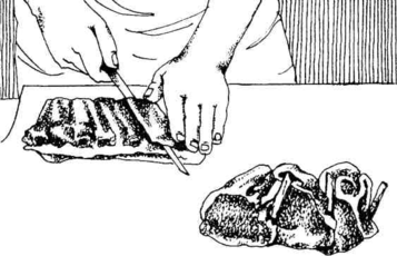 Грудинка фарширована (рис. 80). У грудинки від пахвини прорізують плівки між зовнішнім шаром м'якоті і м'якоттю на реберних кістках так, щоб утворилася "кишеня". З внутрішнього боку грудинки надрізують плівки вздовж ребер. Утворений отвір заповнюють начинкою, розріз закріпляють шпажкою або зашивають. Для начинки використовують гречану (рисову) кашу, м'ясо з рисом або печінку з рисом і вареними яйцями. Гречану або рисову кашу з'єднують з пасерованою цибулею, вареними подрібненими яйцями, меленим перцем, зеленню петрушки або кропу і добре перемішують. Сире м'ясо подрібнюють, додають воду, сіль, мелений перець, пасеровану ріпчасту цибулю, відварений рис і перемішують. Розсипчасту рисову кашу з'єднують з пасерованою цибулею, подрібненою смаженою печінкою, посіченими яйцями, подрібненою зеленню петрушки або кропу.