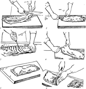 / — зачищання і жилкування; 2 — прорізування "кишені"; 3 — надрізування плівки вздовж ребер; 4 — заколювання отвору шпажкою; 5 — грудинка фарширована, підготовлена для смаження; 6 — порціонування готової грудинки.