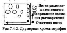 Иногда при сложном составе пробы не удается разделить ее компоненты с помощью одного растворителя. Тогда применяют двумерную хроматографию. В угол квадратного листа хроматографической бумаги наносят хроматографической бумаги наносят раствор пробы и хроматографируют сначала в одном элюенте, затем, повернув хроматограмму на 90, - в другом. Первый элюент производит предварительное разделение компонентов пробы, второй окончательное.