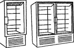 И те и другие шкафы представлены модификациями с сухими и стеклянными дверями, причем в комбинированных моделях (только отечественного производства) объемы среднетемпературной и низкотемпературной секций практически равные. Эти шкафы конструктивно имеют две или четыре дверцы.