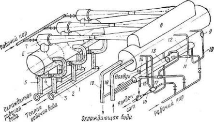 Из вспомогательного конденсатора первой ступени конденсат перепускается в главный конденсатор по U-об разной трубке через уравнительный клапан. Из главного конденсатора жидкость отсасывается конденсатным эжектором, и одна часть ее направляется в испарительную систему (через дроссель к коллектору), а другая — в котел (посредством насоса) для получения рабочего пара, необходимого для действия главных и вспомогательных эжекторов.