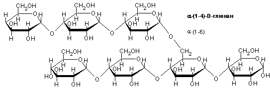 Крахмал представляет собой полимеры α-D-глюкозы, находящейся в двух молекулярых формах: линейной (амилоза)