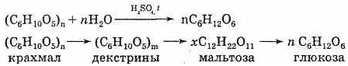 При действии ферментов или при нагревании с кислотами (ионы водорода служат катализатором) крахмал, как и все сложные углеводы, подвергается гидролизу. При этом сначала образуется растворимый крахмал, затем менее сложные вещества — декстрины. Конечным продуктом гидролиза является глюкоза. Можно выразить суммарное уравнение реакции следующим образом: