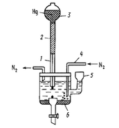 Рис. 1. Простейшая полярографическая ячейка: 1 – стеклянный капилляр; 2 – полиэтиленовый шланг; 3 – груша с металлической ртутью; 4 – стеклянная трубочка с оттянутым концом для ввода азота; 5 – воронка для смены раствора;
