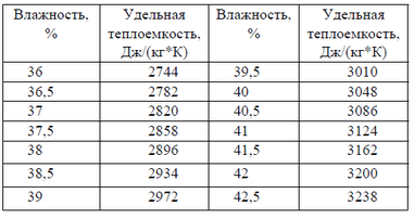 Таблица 1. Удельная теплоемкость макаронного теста в зависимости от его влажности