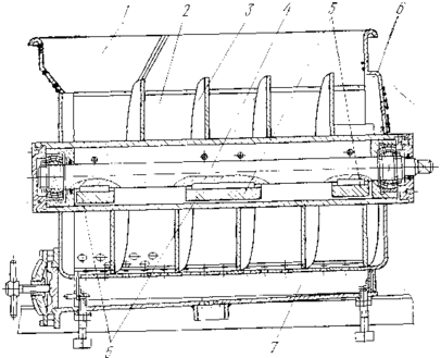 1 – загрузочный бункер; 2 – рабочая камера; 3 – шнек; 4 – приводной вал; 5 – грузы – дебалансы; 6 – короб; 7 сборник