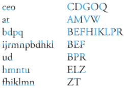 - размер шрифта (в нормальных шрифтах отношение ширины очка к высоте составляет приблизительно 3:4. в узких – 1:2, в широких – 1:1): сверхузкие, узкие, нормальные, широкие и сверхширокие.