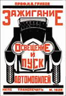 Плоскостной схематизированный рисунок плакатного типа легко увязывается с надписями, трактованными так же плоскостно, с буквами упрощенного рисунка, как бы набитыми по трафарету.