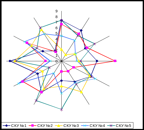 Отобразим графически усредненные экспертные оценки для каждого санаторно-курортного предприятия и рассчитаем площади многоугольников конкурентоспособности для каждого предприятия. Площадь многоугольника конкурентоспособности определяется по формуле: