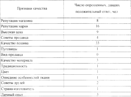 На основе вышеприведенных данных можно сделать вывод, что решающим фактором, определяющим качество товара по мнению потребителей является качество пошива.