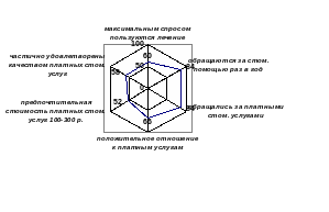 | 1)Максимальным спросом пользуются Лечение Удаление Протезирование 2)Обращаются за стом. помощью редко 1 раз в год 1 раз в полгода 3)обращались за платными услугами да нет 4)отношение к платным услугам положительное отрицательное не имеет значения 5)предпочтительная стоимость платных стом. услуг до 100 р. 100-300 р. более 300 р. 6)удовлетворенность качеством платных стом. услуг полностью частично не удовлетворенны категорически | 30 7 13 2 42 6 42 8 33 14 3 20 26 4 7 29 11 3 | 60 14 26 4 84 12 84 16 66 28 6 40 52 8 14 58 22 6 |