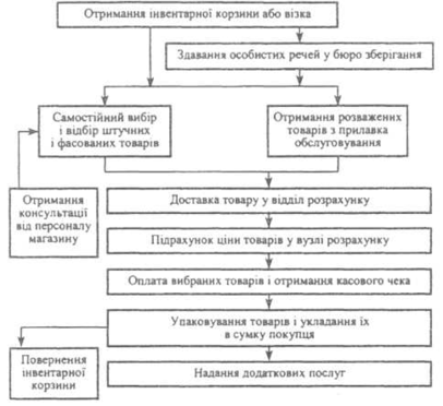 Самообслуговування — це метод продажу, при якому покупці мають вільний доступ до всіх товарів, відкрито викладених у торговому залі магазину на пристінному та острівному обладнанні, і повну можливість самостійно оглядати і вибирати товари без допомоги продавця, а оплачувати покупки у вузлі розрахунку, розташованому при виході з торгового залу магазину. Процес продажу товарів у магазині самообслуговування схематично відображено на рис. 1.