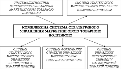 З позиції системного підходу стратегічне управління маркетинговою товарною політикою стає невід’ємною частиною всього комплексу маркетингу та менеджменту підприємства та являє собою цілісну динамічну соціально-економічну систему, яка складається з сукупності взаємопов’язаних елементів різноманітного ступеню складності та організації. Кожна з наведених систем структурно інтегрує в собі відповідні підсистеми, від гармонійної взаємодії яких залежить ефективність стратегічного управління маркетинговою товарною політикою підприємства.
