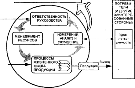 На рисунке 1 приведена основанная на процессном подходе система менеджмента качества, описанная в семействе стандартов ИСО 9000. Он показывает, что заинтересованные стороны играют существенную роль в предоставлении организации входных данных. Наблюдение за удовлетворенностью заинтересованных сторон требует оценки информации, касающейся восприятия заинтересованными сторонами степени выполнения их потребностей и ожиданий. Модель, приведенная на рисунке 1, не показывает процессы на детальном уровне [1].