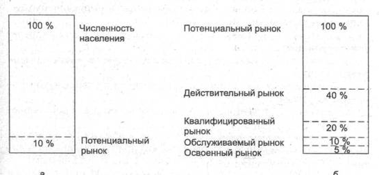Рисунок 1. Качественная структура рынка: а — весь рынок; б — потенциальный рынок