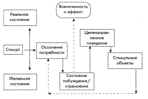 Мотивация (motivation) связана с концепцией движения (motion). Мотив — это невидимая, неявная внутренняя сила, стимулирующая и вынуждающая поведенческую реакцию и обеспечивающая специфическое направление для этой реакции. Мотив невидим, вывод о существовании мотивов можно сделать, например, исходя из поведения индивидуумов. На рис. 1 показана модель процесса мотивации, основными элементами которой являются: активация потребности, состояние побуждения, целенаправленное поведение, стимульные объекты и аффект. [3, стр. 108]
