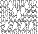 Такие полотна обладают меньшей растяжимостью, распускаемостью и прочностью, чем гладь. В производстве женских капроновых чулочных изделий применяют прессовые переплетения с раппортом 1:1 под названием “микромеш” (рис. 9), у которого ряд прессовых петель чередуется с рядом обычных с затяжкой последних. Поэтому такой трикотаж не распускается. Из двойных гладких прессовых полотен широко известны фанг и полуфанг. Фанг по внешнему виду напоминает ластик, по отличается тем, что у него столбики петельных палочек разделены столбиками дуг. Как видно из рис. 10, у фанга на лицевой и изнаночной сторонах петли удлиненной формы и на каждой из них лежит дополнительная нить в виде наброска, благодаря чему он менее растяжим, имеет большую толщину, малую распускаемость и высокие теплозащитные свойства.
