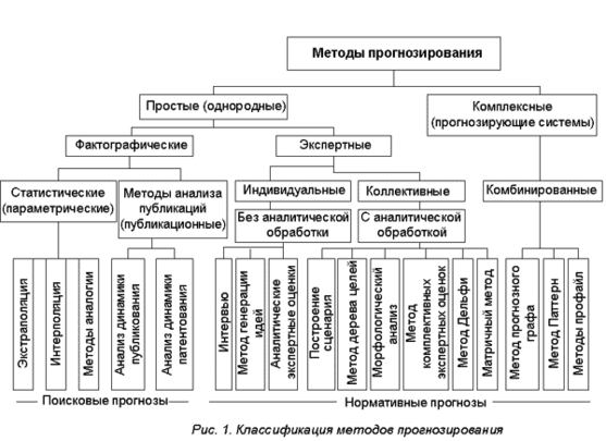 Единого, универсального, метода прогнозирования не существует. В связи с огромным разнообразием прогнозируемых ситуаций имеется и большое разнообразие методов прогнозирования (свыше 150). На рисунке 2.1 представлен один из вариантов классификации методов прогнозирования, основанной на индуктивном и дедуктивном подходах