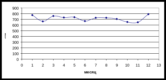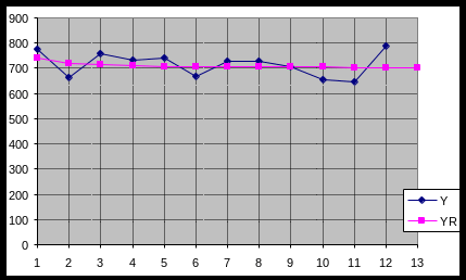 Таким образом, точечный прогноз цены 703,22, интервальный прогноз [607,73; 798,71].