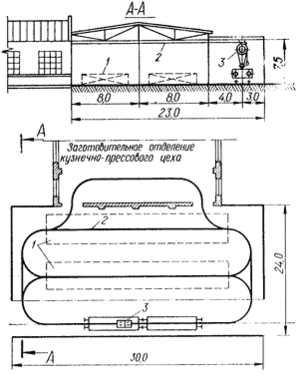 Прицеховой закрытый и полузакрытые склады металла соответственно с внутренней и внешней разгрузкой представлены на рисунках выше.