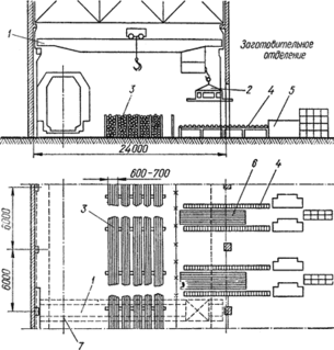 Рис.1 закрытый склад металла с внутренней разгрузкой: 1 — мостовой кран; 2 — грузозахватное устройство; 3 — стоечные стеллажи; 4 — рольганги; 5 — станок заготовительного отделения; 6 — стеллажная площадка; 7 — ветвь железнодорожного пути