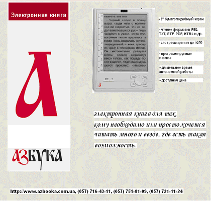 Электронная книга «Азбука» - устройство для чтения электронных книг, является мобильным специализированным компьютером с 5-ти дюймовым бумагоподобным TFT-экраном.