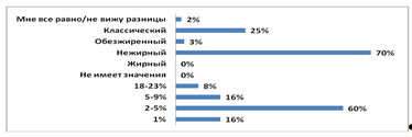 Жирность творога также занимает не последнее место при выборе творога. Я рассмотрела жирность и в процентном соотношении и в буквенном. Большинство респондентов предпочитают нежирный 2-5% творог(70%), классический -25%, а также 2% респондентов ответили, что не видят никакой разницы.