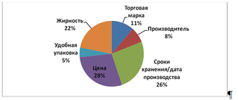 При покупке творога, покупатели в основном руководствуются ценой (30 %), сроком хранения(27%) и качеством (23 %).