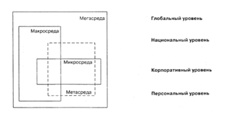 На глобальному рівні головна дія на формування і розвиток культури фірми надає мегасередовище міжнародного бізнесу. Макросередовище відповідає національному рівню. Відповідно корпоративний рівень багато в чому визначає мікросередовище з своєю культурною специфікою. І нарешті, на персональному рівні працівника культура в значній мірі визначається метасередовищем (особовими культурними константами людини).